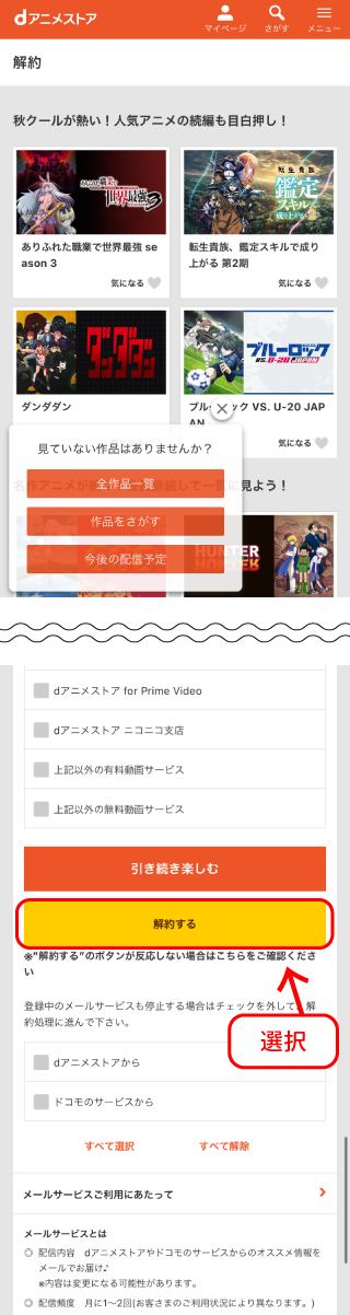 ※メールサービスも合わせて停止する場合は、「解約する」ボタンの下部にある「登録中のメールサービス」のチェックボックスのチェックを外してください。 - 解約手続きTOPページへ遷移したら、「dアニメストアを解約する」のチェックボックスにチェックがついている事を確認します。