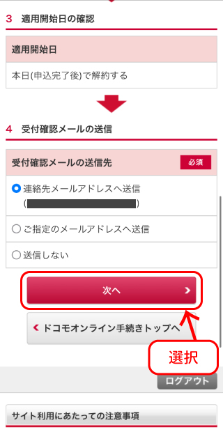 ※「dアニメストアの注意事項に同意する」のチェックは、注意事項のページをスクロールし、最下部にある「閉じる」のボタンを選択しなければチェックをする事ができませんのでご注意下さい。 - そのまま画面を下部スクロールし、「サービス停止の適用開始日」、「受付メールの受信アドレス」を確認し、「次へ」のボタンを選択します。