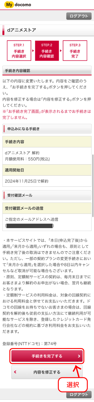 - サービス停止の確認画面へ遷移しますので、内容確認の上、画面を下部にスクロールし「手続きを完了する」を選択します。